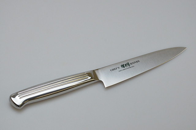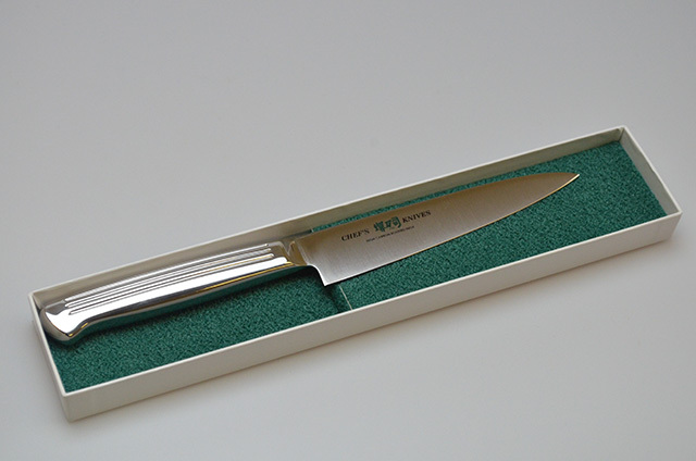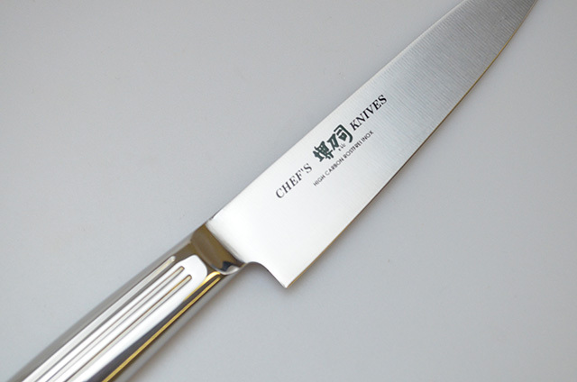 刀身と柄を一体成型した庖丁で、雑菌が付きにくく衛生的。水による侵食がないので柄が腐り、抜け落ちる心配がありません。モリブデン鋼は含有炭素量を高め、不純物を減少させてあるのでステンレス包丁の中では刃付き、刃もちがよく、サビに強く、切れ味の持続性の良い庖丁。