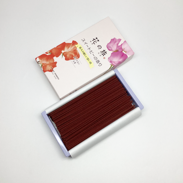TOP 線香線香 【奥野晴明堂】花の旅 スイートピーの香り 価格: ¥1,100 (税込) 販売期間: 備考欄(必要時のみ): 数量: 箱 在庫: 在庫あり 在庫 在庫あり 返品についての詳細はこちら スイートピーは、香りが良いということを意味する英語「sweet(スイート)」と、マメ科の植物を表す「pee(ピー)」を合わせて名づけられています。花言葉は「優しい思い出」 香りは、ほのかに香るやわらかな香りで、リラックス効果もあるそうです。 誰よりも好きだった「故人の優しい思い出」と共に、やわらかなスイートピーの香りをお楽しみください。 商品詳細 内容量:約100g/煙ひかえめタイプ