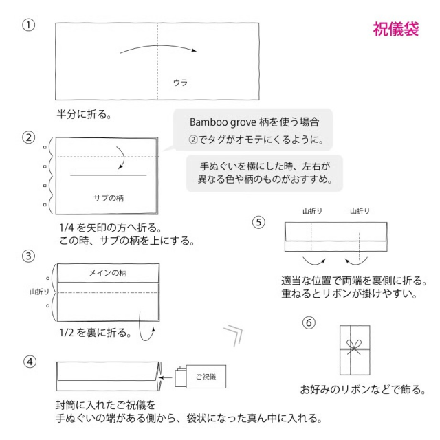お祝い事に手ぬぐいを祝儀袋にして渡したら、もらった後も使える記念品。祝儀袋にした時の柄のコントラストを計算して竹林をデザインしました。まっすぐに空に向かって伸びながらも、しなやかな竹は生命力や繁栄などを象徴する縁起柄です