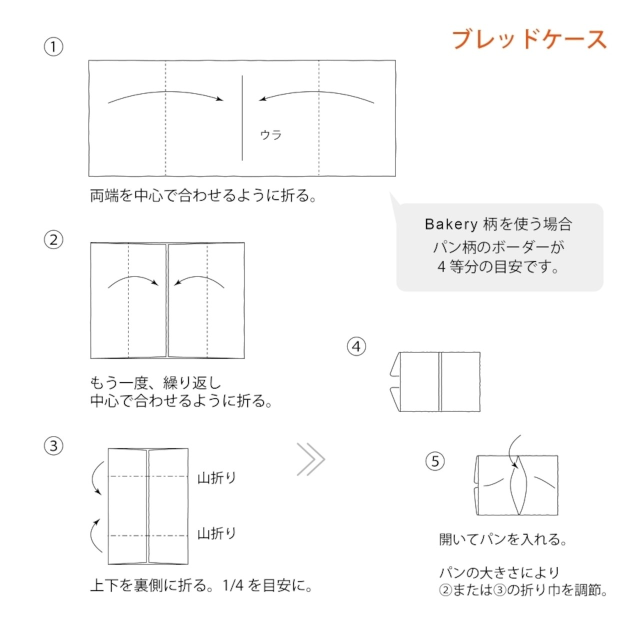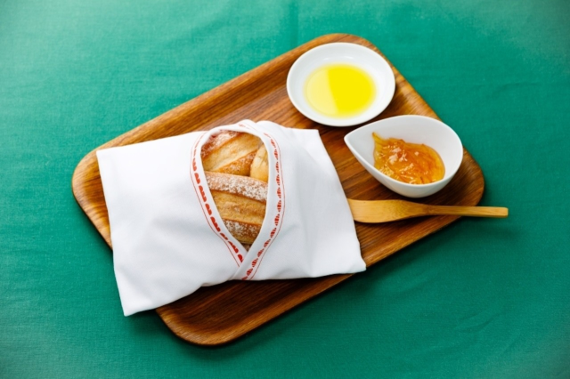 焼き立てパンの湿度調整にも使えるのが和晒手ぬぐいの優れたところ。だからパンをサーブするときの包みを考えました。パン柄のボーダーを目安にレシピ通りたためば簡単に出来上がります。ひと工夫でワンランク上の朝食をお楽しみください。