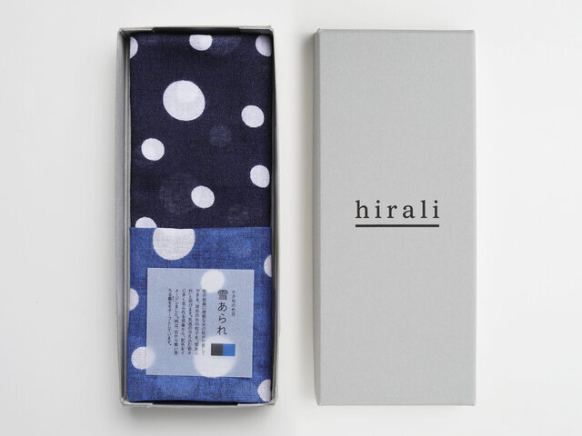 雪の結晶に微細な氷の粒が付着してできる、球形の氷の粒子を「雪あられ」と呼びます。気温の冷え込む朝夕に多く見られる現象から、配色をイメージしました。柄は、空から舞い落ちる霰をモチーフとしています。